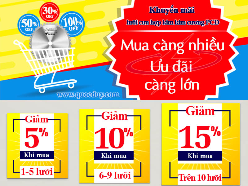 Nhân dịp kỉ niệm ngày Đại lễ 30/4 - 1/5 công ty Quốc Duy trân trọng gửi tới Quý khách hàng chương trình khuyến mãi đặc biệt : giảm giá lên tới 50% đối với sản phẩm " lưỡi cưa hợp kim kim cương PCD " của Quốc Duy cung cấp.