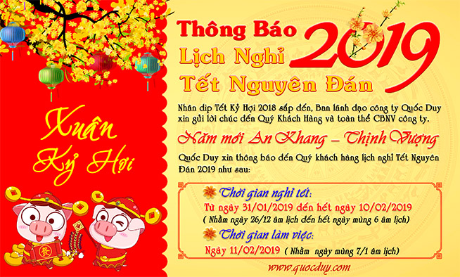 Nhằm mang lại dịch vụ tốt nhất, đảm bảo tiến độ công việc cho khách hàng và các đơn vị đối tác, Máy chế biến gỗ Quốc Duy xin thông báo tới Quý khách hàng- Đối tác và toàn thể các bộ nhân viên Quốc Duy về lịch nghỉ tết Nguyên đán 2019 như sau: