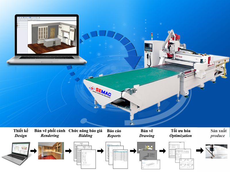Để rút ngắn thời gian sản xuất bằng quy trình sản xuất nội thất hoàn thiện và tự động hoàn toàn theo công nghệ 4.0 thì cần có một phần mềm thiết kế nesting, máy in tem và dán tự động, máy dán cạnh tự đông, máy khoan ngang cnc,băng chuyền đưa phôi….